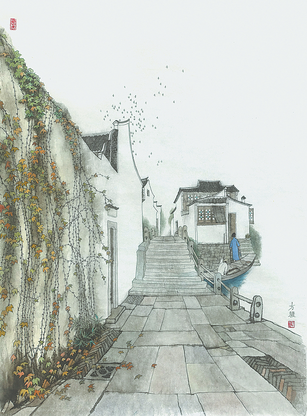 Also, through this intimacy with the scenery, partly realistic and partly imagined, one's mind is driven to the depths of history to conduct a dialogue with the master landscape painters who lived centuries ago, such as Dong Yuan, Zhao Mengfu and Dong Qichang, whose philosophical takes on the relationship between people and the universe are reinterpreted in Fang's delicate paintings and calligraphy strokes.