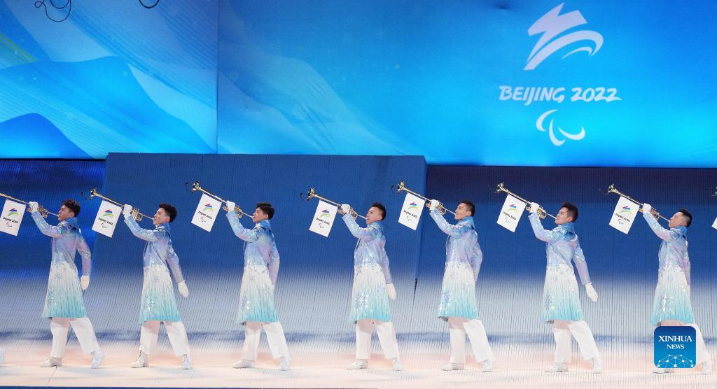 Trumpeters call out a welcome melody during the opening ceremony of the Beijing 2022 Paralympic Winter Games at the National Stadium in Beijing, March 4, 2022. [Photo/Xinhua]