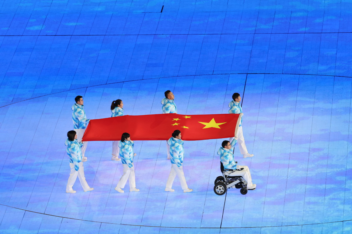 The National Flag of the People's Republic of China is carried during the opening ceremony of the Beijing 2022 Paralympic Winter Games at the National Stadium in Beijing, March 4, 2022. [Photo by Feng Yongbin/chinadaily.com.cn]