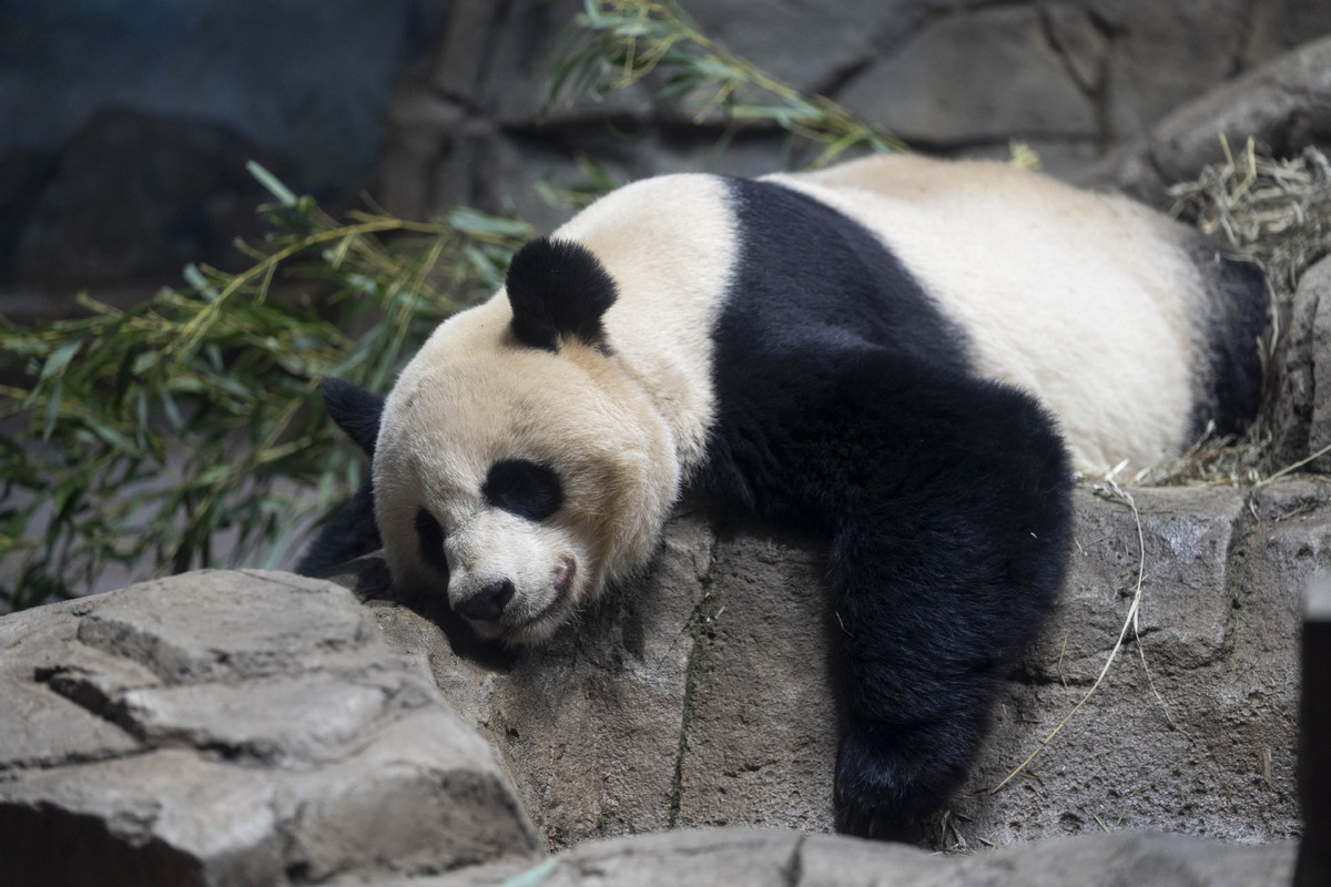 During the interview with Smith, Mei Xiang and Xiao Qi Ji frolicked in an outdoor field of the panda house, while Tian Tian leisurely chewed on bamboo in another field as visitors streamed in to observe the pandas.