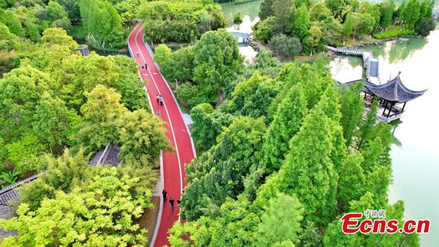 People exercise on the newly-built trail at Zhangjiang National Wetland Park, Ganzhou, East China's Jiangxi province. Colored trail winding along the lakeshore looks like a red ribbon at the park. [Photo/China News Service]