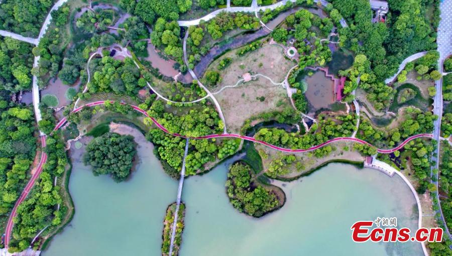 People exercise on the newly-built trail at Zhangjiang National Wetland Park, Ganzhou, East China's Jiangxi province. Colored trail winding along the lakeshore looks like a red ribbon at the park. [Photo/China News Service]
