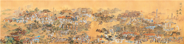 The two paintings, when joined together, are 2.7 meters in length and 75 centimeters in width, including more than 800 characters and 39 landmarks from the two cities.
