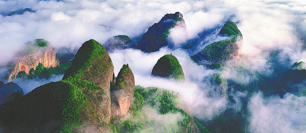 The highest of the eight peaks stands 818 meters above sea level, and the lowest 450 meters. There are about 130 scenic spots in the zone-many of which are microscopic landforms formed by water erosion-and sightseers can see them on the two sides of the delicately-designed travel routes meandering through the peaks. It takes about three hours to finish the tour on foot.