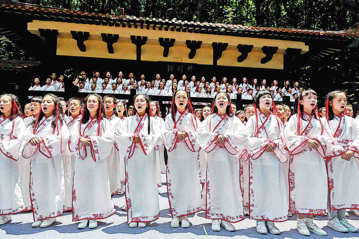 Primary and middle school students in Wuhan, Hubei province, chant poems written by Qu Yuan, a patriotic poet in the Warring States Period (475-221 BC). ZHANG CHANG/CHINA NEWS SERVICE