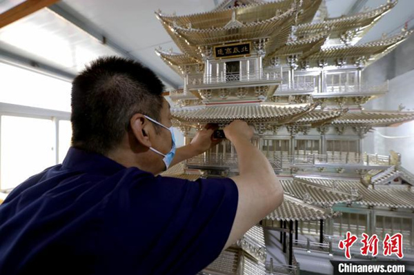 "Compared with the real Tangwang Pavilion, making this miniature version was not that easy. All its parts are so small that you must be careful, otherwise you will screw it up. You must be patient and persevering," said Qian.