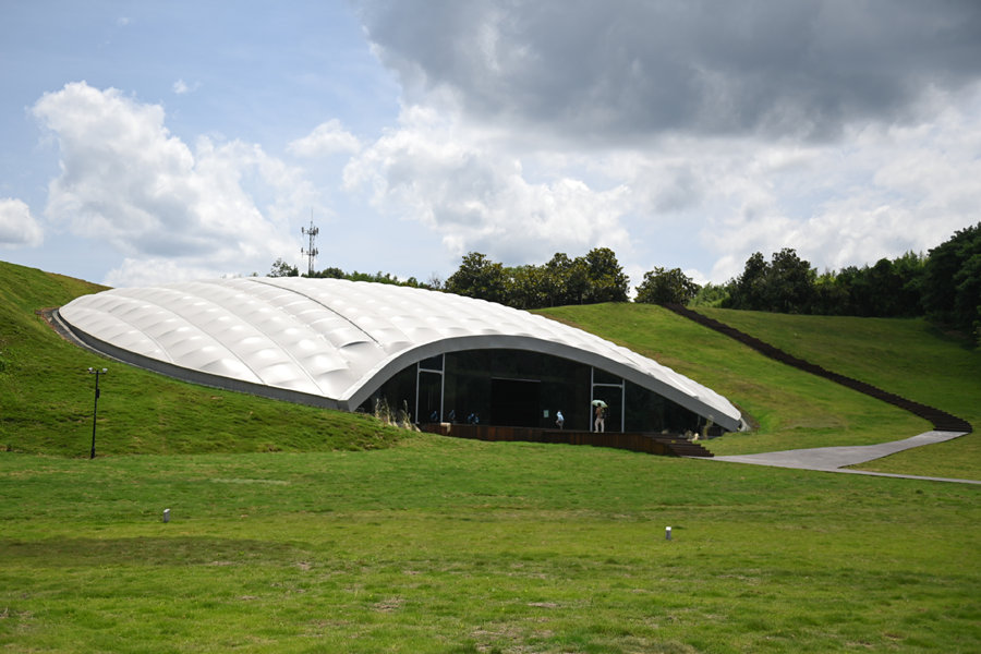 Visitors view Laohuling site of the Archaeological Ruins of Liangzhu City, July 6, 2022. [Photo/Xinhua]