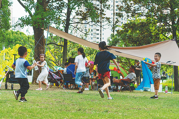 Aware of the camping trend, many shopping malls, parks and restaurants have been organizing related events to attract customers. The Bund Financial Center, for example, rolled out a 10-day event at its plaza from June 25 to Monday, providing a novel camping experience near the Bund. At the Aegean Place Shopping Center, a similar camping festival kicked off on July 1. The event, which also features performances and activities for children and pets, runs through August. Manner Coffee, a domestic coffee chain, has also set up tents at its branch located along the Xuhui River.