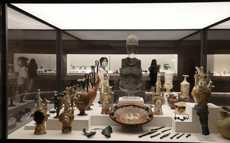 A visitor views the funerary objects at the exhibition on July 11, 2022. [Photo by Jiang Dong/China Daily]