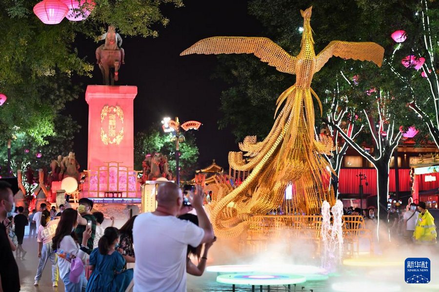 Tourists appreciate the performance in Tang Paradise, a national-5A theme park in the fashion of a royal garden of the Tang Dynasty, in Qujiang district of Xi'an, Shaanxi province, on July 18, 2022. [Photo/Xinhua]