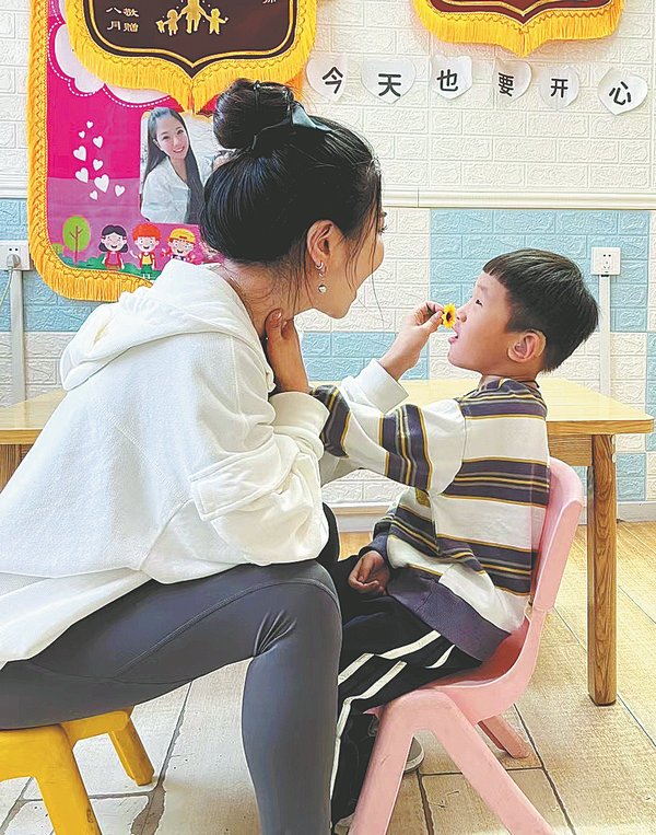 A teacher at the Little Sunflower Rehabilitation Center in Wuhan, Li has gained experience and developed her own techniques for training the children to speak.