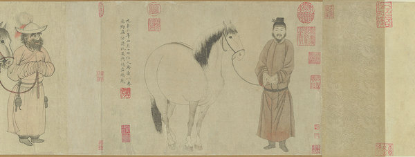 On both occasions, Xie asked if another picture of the same theme could be added to the existing one, and his wish was granted both times, resulting in a paint scroll that features, in succession, three pairs of horse and groom, as rendered by three generations of the Zhao family.