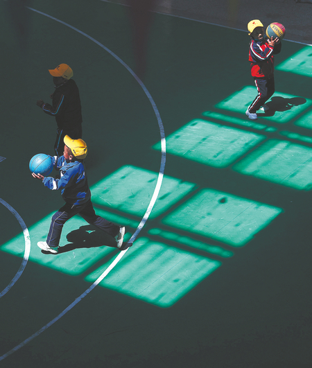 At an indoor gym, pupils play basketball. FEI MAOHUA/JIGME DORJE/XINHUA