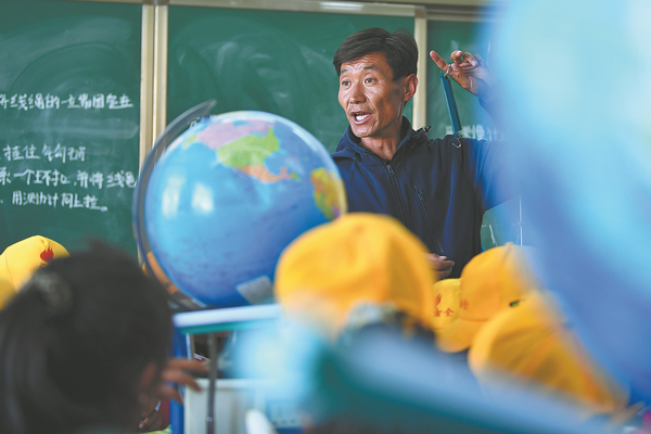 Danba Rinqen, school vice-president, gives pupils the formula for success in a science class. FEI MAOHUA/JIGME DORJE/XINHUA