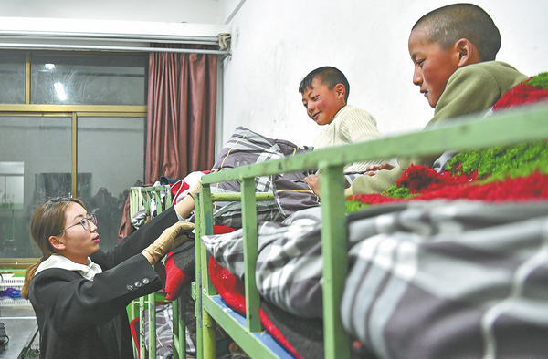 A teacher helps pupils get their beds ready. FEI MAOHUA/JIGME DORJE/XINHUA