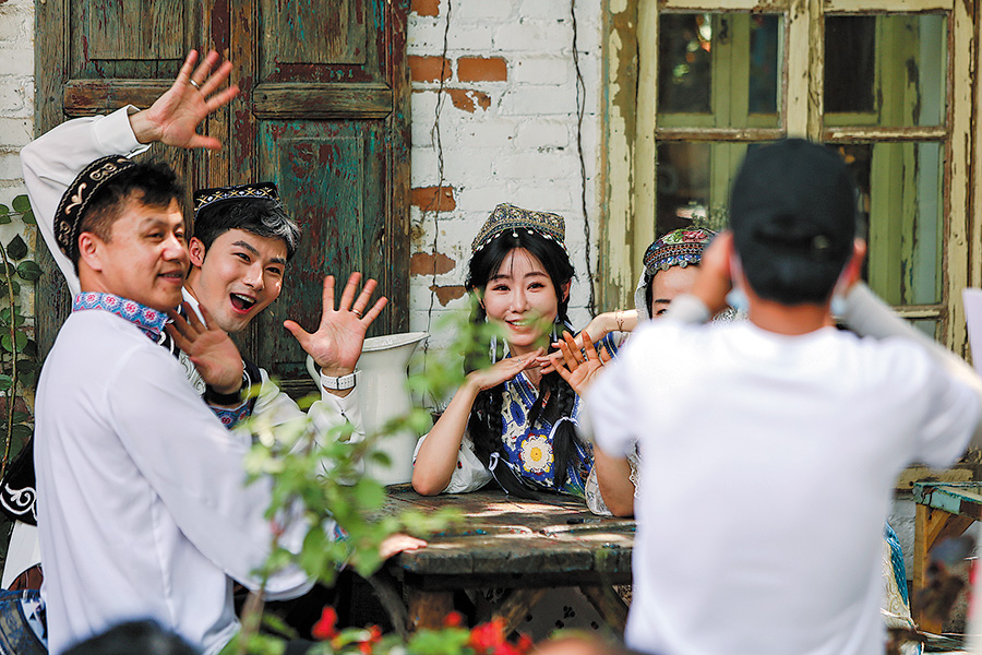 Tourists take photos at the Liuxing street scenic spot in Yining, Xinjiang, on May 17.[Photo/Xinhua]