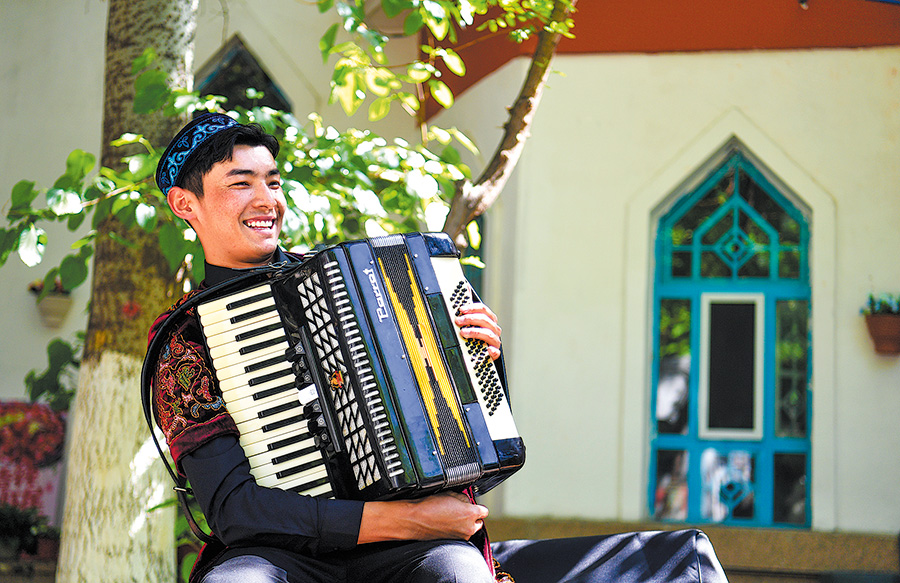 A musician plays the accordion at Liuxing Street, Yining, Xinjiang Uygur autonomous region, on May 17.[Photo/Xinhua]