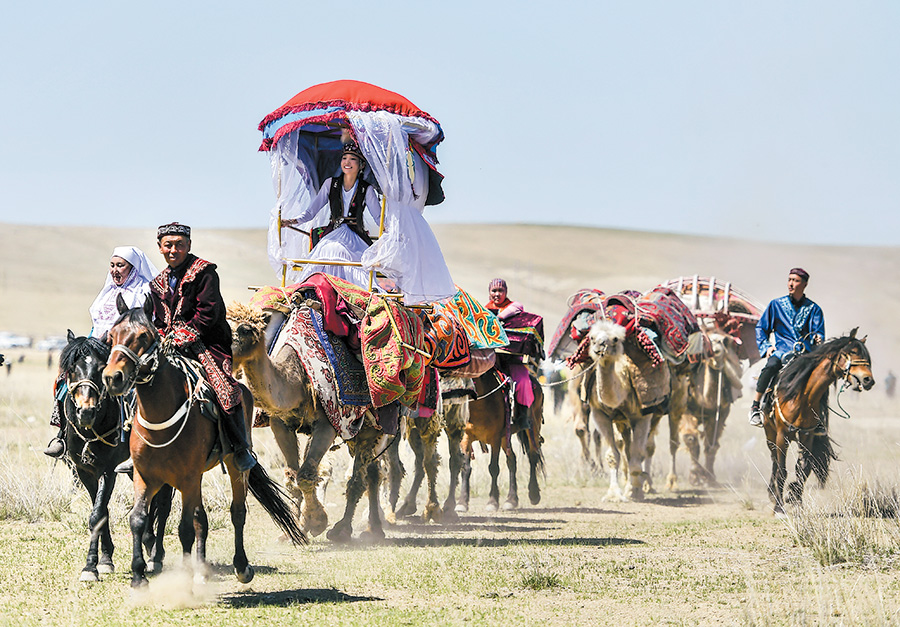 The Million Altay Sheep Transition Cultural Tourism Festival is held in the Shaerbluk transition cultural tourism town, Fuhai county, Xinjiang, on June 4.[Photo by Liu Xin/China News Service]