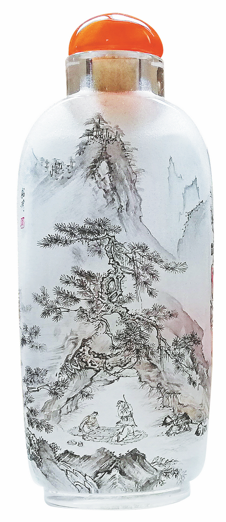 The mouth of a snuff bottle is usually not big enough for a soybean to pass through. Consequently, the complex patterns drawn inside represent an extraordinary feat.