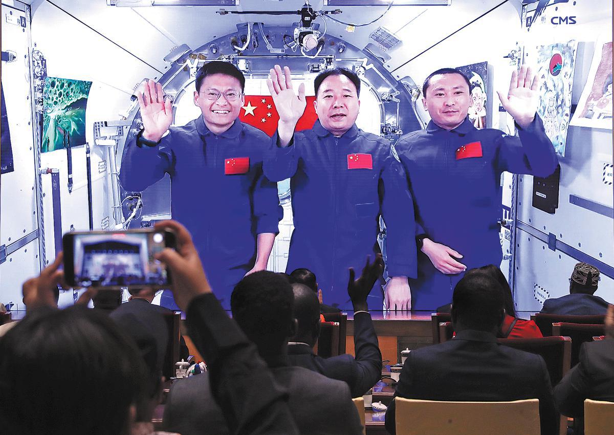At the awarding ceremony held on Wednesday in Beijing, the three astronauts who are conducting a mission at Tiangong introduced the 10 paintings to the audience, including winners and participants, through a recorded video call from the space station.