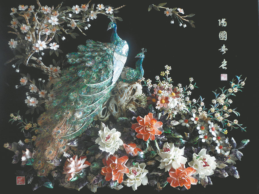 To make colorful artworks, Jin has gathered shells from across the world. Abalone pieces from Australia, the United States and Canada are widely used in his works.