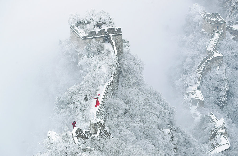 A couple take pictures on the Great Wall on Dec 14. [Photo by ZOU HONG/CHINA DAILY]