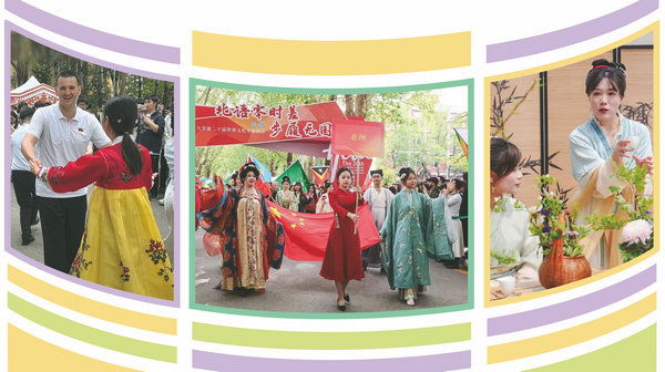 Left: Dylan Walker (left) dances with a student from the Democratic People's Republic of Korea during the 20th World Culture Carnival at Beijing Language and Culture University on April 26. Middle: Delegations from various continents march in during the carnival's opening ceremony. Right: Chinese students showcase traditional flower arranging at the event. [Photo provided to China Daily]