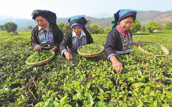 Hani women are busy harvesting tea leaves in Pu'er, a major tea-producing city on the Ancient Tea Horse Road in Yunnan. [Photo by Zhang Wei/China Daily]
