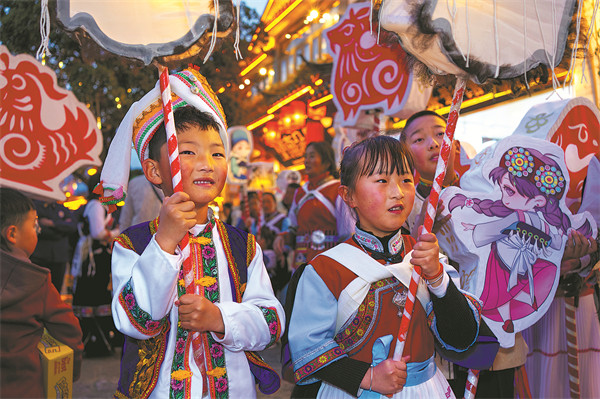 Naxi children in traditional attire celebrate Lantern Festival in February in Lijiang, Yunnan. [Photo by He Zhao/For China Daily]