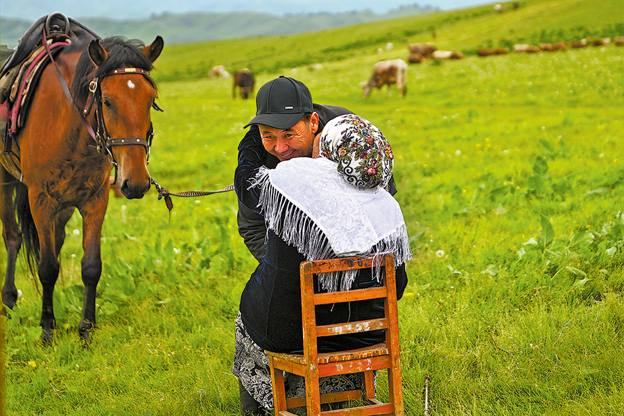 The herdsman hugs his mother after the three-day trek on horseback.[Photo/Xinhua]