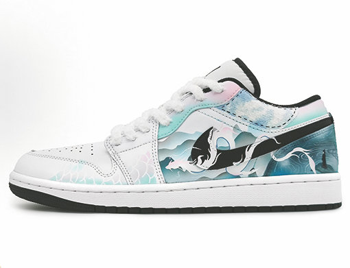 One of his most popular collections was inspired by the animated film White Snake (2019), a modern retelling of a classic Chinese legend. The design features a dragon that coils gently around the shoe's emblem, blending into a misty mountain background. A silhouette emerges from the clouds on the heel, adding a scent of romantic mystique.
