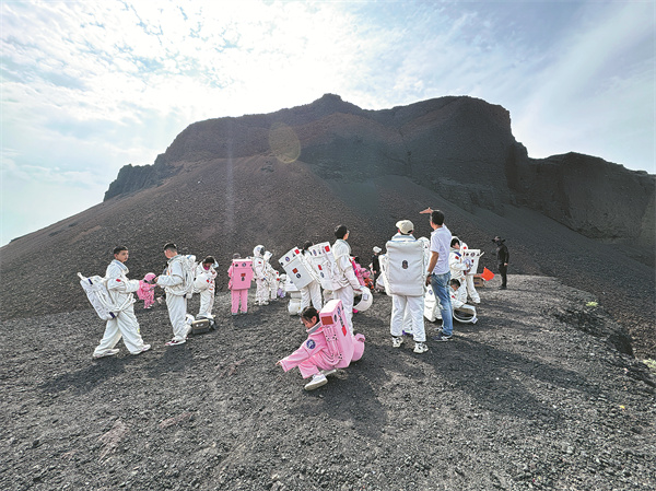 Earlier this month, I visited the Ulanhada volcanic geopark in Ulaanqab, North China's Inner Mongolia autonomous region, and found myself in this otherworldly scene against the backdrop of a volcano with dark rocks.