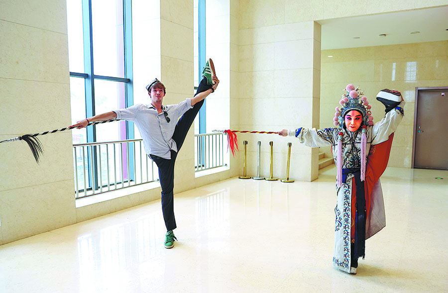 Under the guidance of a Peking Opera performer, an Italian dancer tests his agility in the ancient opera form in the Urumqi Peking Opera House. [PHOTO BY ZOU HONG/CHINA DAILY]