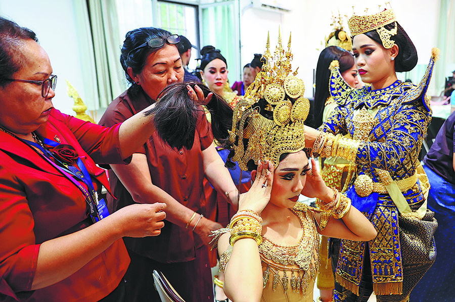 With help from several hands, a dancer with the Royal Ballet of Cambodia, who is a specialist in Khmer classical dance, adjusts her delicate headdress before performing in Karamay, an oil-rich city in northern Xinjiang. [PHOTO BY ZOU HONG/CHINA DAILY]