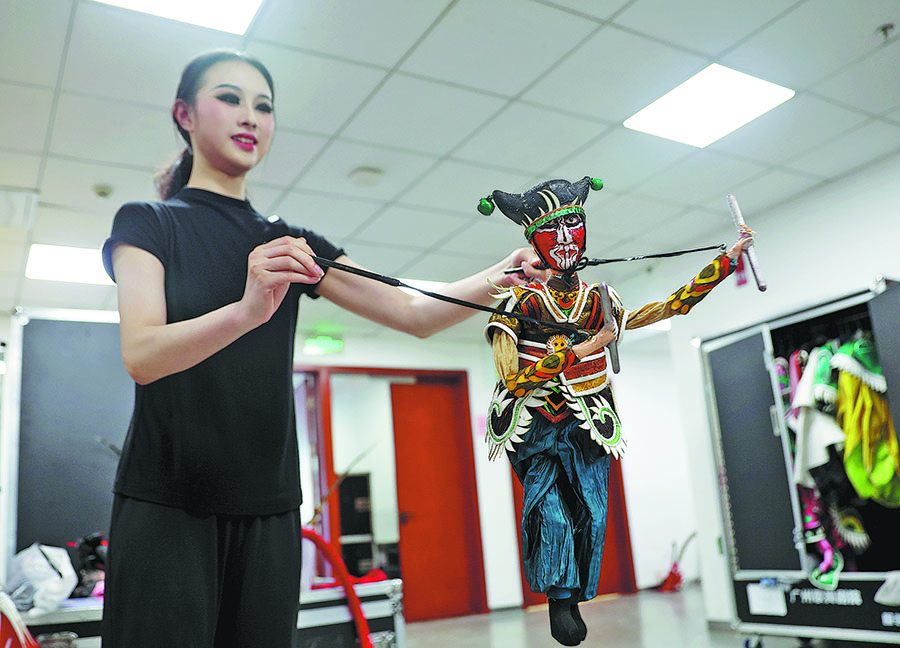 A performer demonstrates rod-controlled puppetry, a national intangible cultural heritage, backstage in Urumqi. [PHOTO BY ZOU HONG/CHINA DAILY]