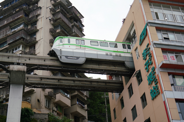 A metro train runs through a residential building in Chongqing, a scene that has been viewed by millions online.[Photo by Xu Lin/China Daily]