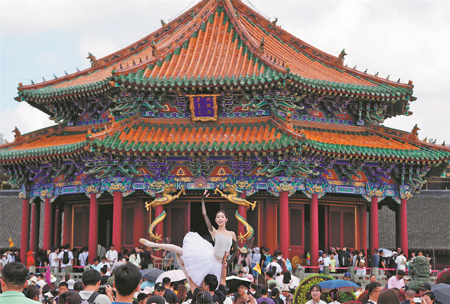 In front of the grand Dazheng Hall at the Shenyang Imperial Palace Museum, a ballerina is lifted by her dance partner.[Photo provided by Li Gang/Zhu Huaqiang/Wu Qinghao/Yang Qing/Pan Yulong/Xinhua]