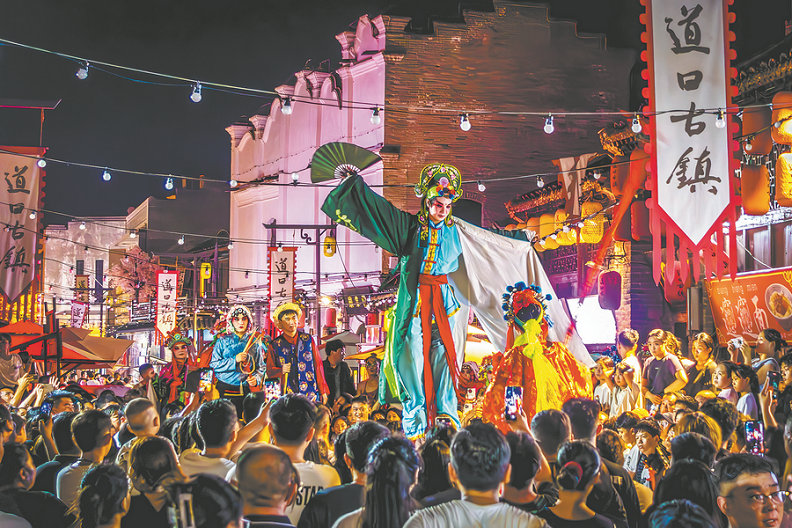 Stilt walkers dressed in colorful costumes perform at Daokou ancient town in Huaxian county, Anyang, Henan province. WANG ZIRUI/FOR CHINA DAILY