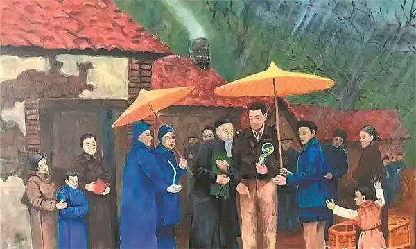 A painting by Thomas Macia, son of James Herbert Macia Jr, of his father and the villagers who rescued the US pilots in Shangrao, Jiangxi province. [Photo provided to China Daily]