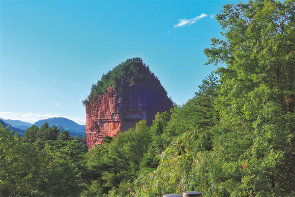 Seen from afar, the Maijishan Grottoes resemble a stack of wheat piled high by farmers. [Photo by Jiang Dong/China Daily]