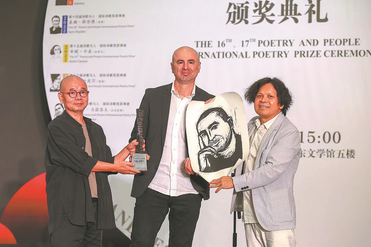 The Poetry and People — International Poetry Prize honors North Macedonian poet Nikola Madzirov in Guangzhou, Guangdong province, on August 30, recognizing his contributions to the literary world.[Photo provided to China Daily]