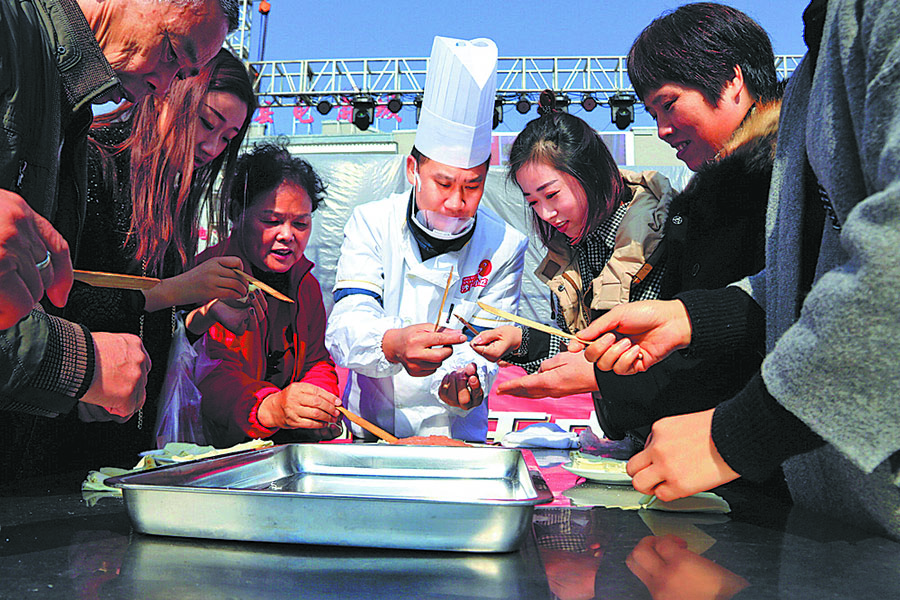 Diners enjoy a hands-on experience making bianrou (minced pork dumplings) at a food festival in Shaxian district, Sanming city, Fujian province. [Photo provided to China Daily]