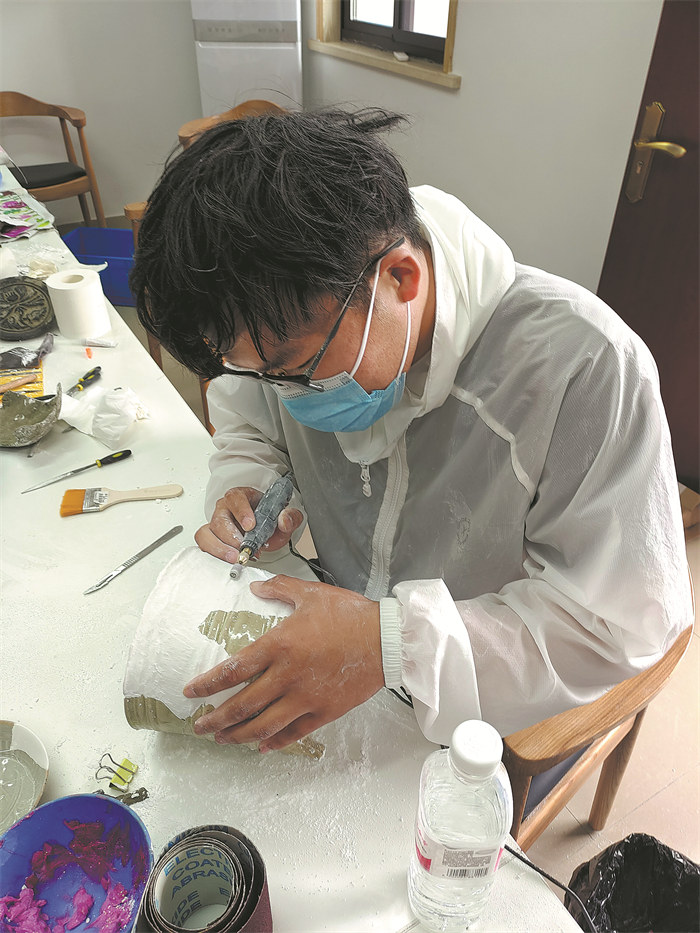 A conservator works meticulously to restore a cultural relic. [Photo provided to China Daily]