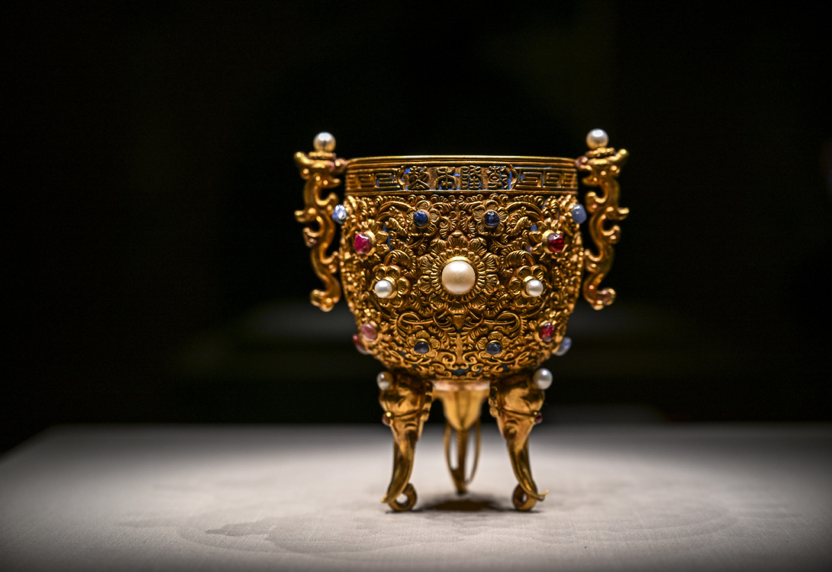 A "Jin'ou Yonggu" Cup (Golden Vase of Lasting Stability), an imperial treasure from the Qing Dynasty (1644-1911), is displayed at an exhibition in the Palace Museum to mark its 100th anniversary. [Photo/Xinhua]