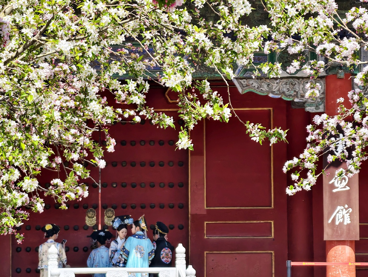 Crabapple trees bloom in front of the Hall of Literary Brilliance at the Palace Museum in Beijing on April 1, 2025. [Photo/Xinhua]