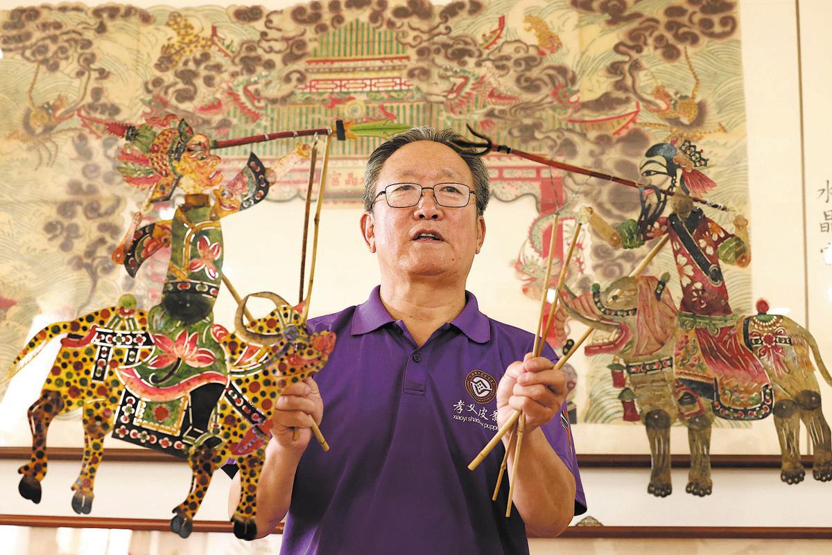 Hou displays traditional Xiaoyi shadow puppets at his studio. ZHU XINGXIN/CHINA DAILY