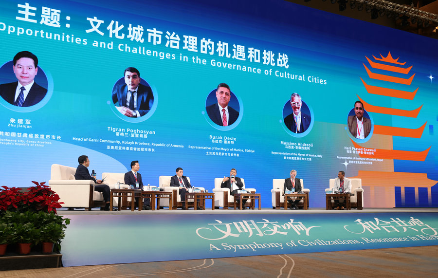 Guests engage in discussions on the opportunities and challenges of cultural urban governance during the main dialogue session of the "Global Mayors Dialogue · Dunhuang" in Dunhuang, Gansu province, Oct 13, 2025. [Photo by Chen Zebing/chinadaily.com.cn]