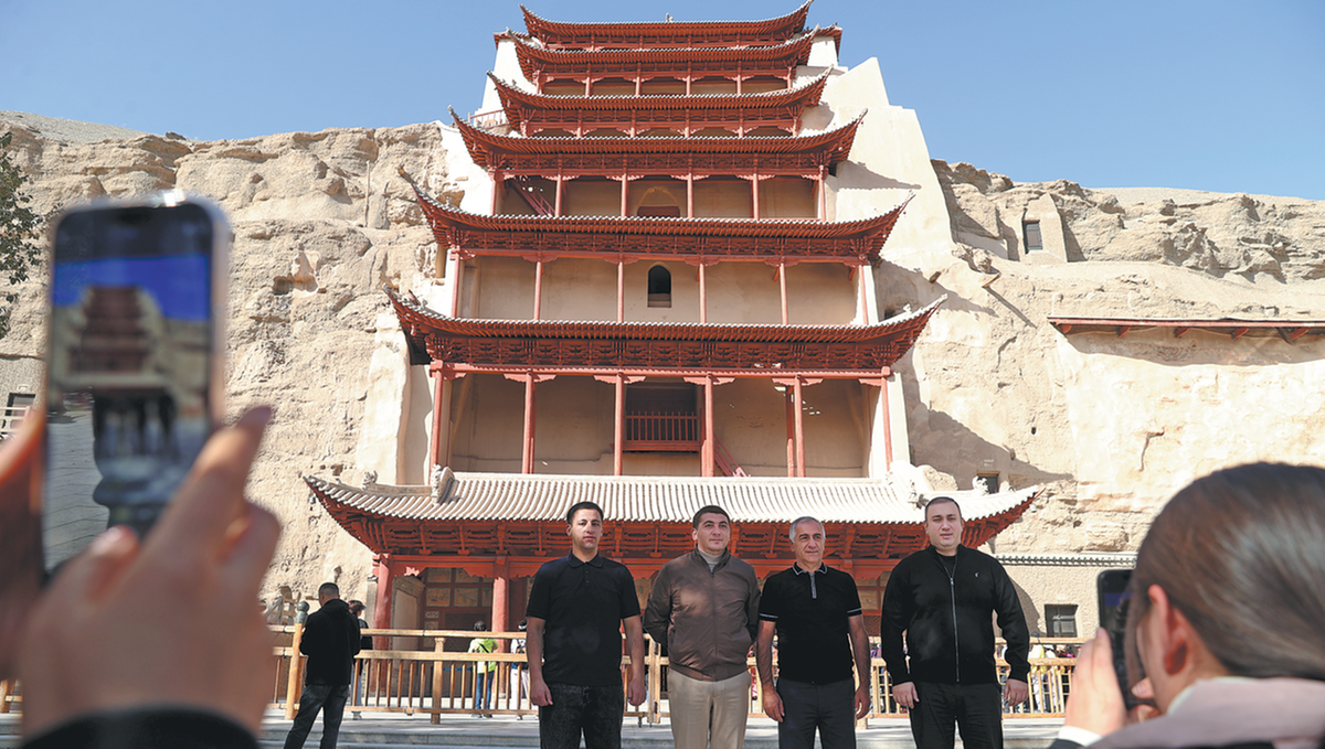 Overseas participants of the 2025 "Global Mayors Dialogue ・ Dunhuang" visit the Mogao Caves on Sunday. CHEN ZEBING/CHINA DAILY