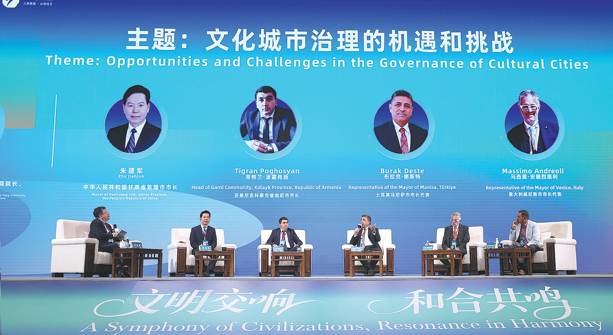 Mayors and major representatives discuss the opportunities and challenges in the governance of cultural cities at the event on Monday. CHEN ZEBING/CHINA DAILY