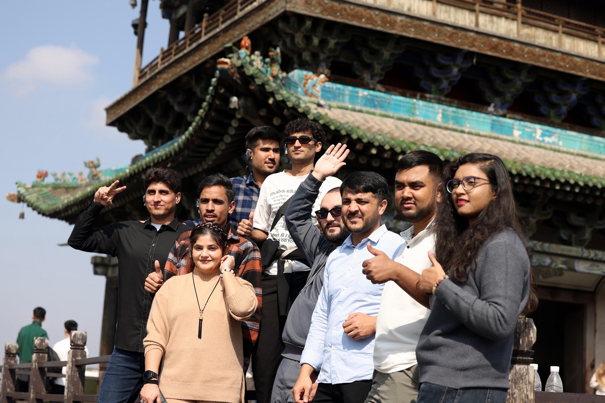 Foreign vloggers pose for photos at Pingyao Ancient City in Jinzhong, Shanxi province, on Oct 15, 2025. [Photo by Zhu Xingxin/chinadaily.com.cn]